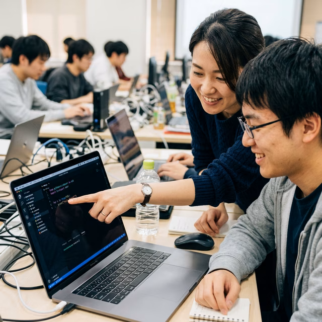 周りを気にせず自分のペースで進められます。映像教材と直接指導のハイブリッド。